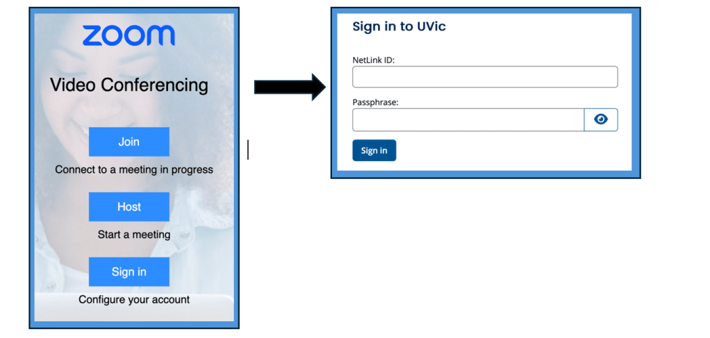 - From the options on the UVic Zoom portal page, click ‘Sign in,’ then enter your ‘UVic Netlink ID’ and ‘password’.
