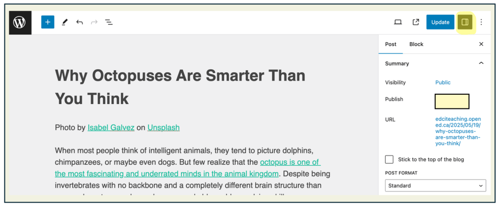 | Task: Open one of your blog posts and assign it to a category. Make sure to scroll down to find the dropdown menu, select the appropriate category (e.g. Deep Dive Inquiry assignment), and then click Update or Publish at the top of the screen to save your changes. |