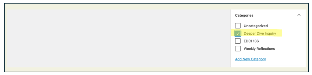 - A dropdown menu will appear showing the categories you created in the other guide. Click the category that your post belongs to. For example, if it’s a Deep Dive Inquiry assignment, click that category to assign your post correctly.