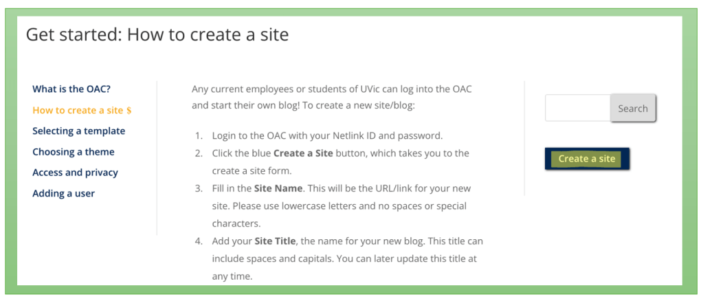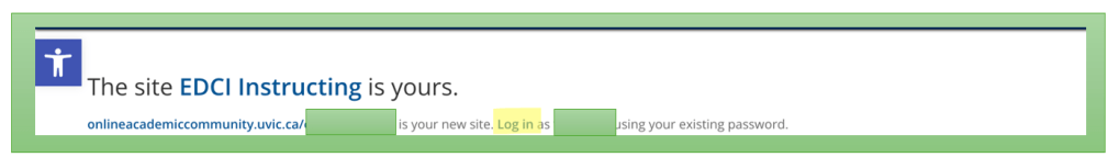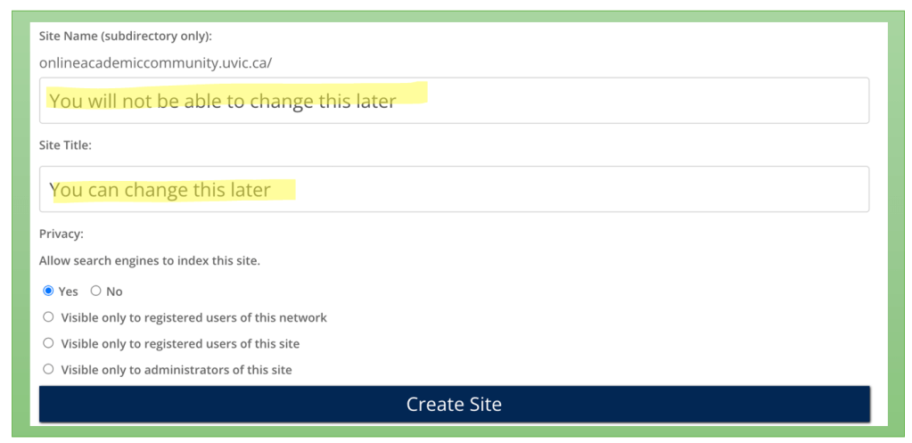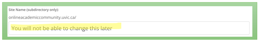 Important: This will become your site’s URL. If you choose (randysmith), your URL will be onlineacademiccommunity.uvic.ca/randysmith. You will need to remember this for later.