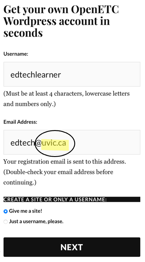 Tip – Consider choosing a site domain that is not directly connected to a specific course (i.e., edci136learning). This allows you to use your OpenETC site for a variety of purposes (personal, professional, academic, etc.)