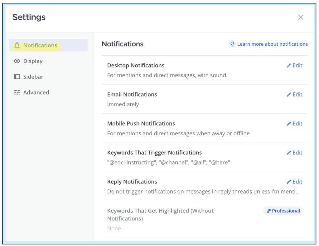 | Important: As you can see under the Keywords That Trigger Notifications section, there are certain keywords that will trigger notifications. This can be particularly helpful if you need to notify all members or get in touch with your instructor. You can do this by typing @ followed by your instructor’s username (e.g., @instructorusername). |