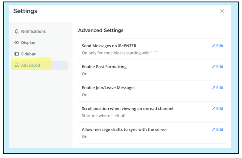 | Task: Go to your Mattermost dashboard and click the Settings icon in the upper right-hand corner. Explore the options on the left-hand side, including Notifications, Display, Sidebar, and Advanced. Adjust your notification preferences to ensure you won’t miss important messages, and customize other settings to make Mattermost work best for you. |