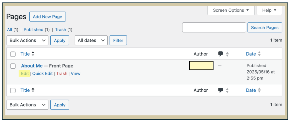 You can do the same cleanup process for Pages. Navigate to Pages from the side menu in your Dashboard and delete any default or sample pages that you did not create.