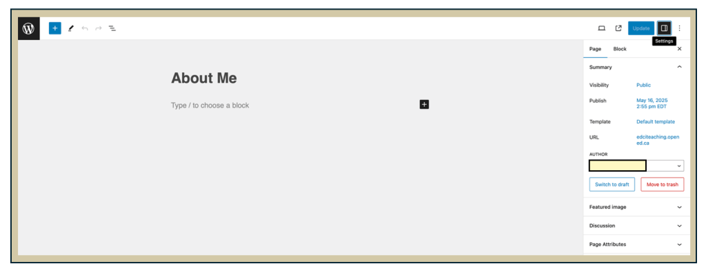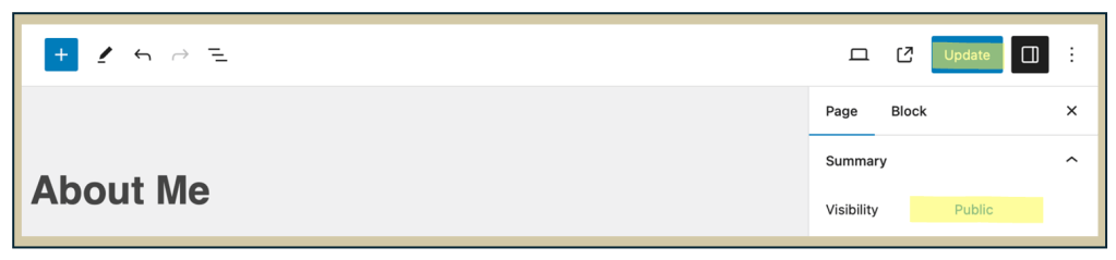 Once you’ve finished customizing your About Me page, make sure the visibility is set to Public, then click Update or Publish (depending on what appears—both buttons are in the same spot in the top right corner).