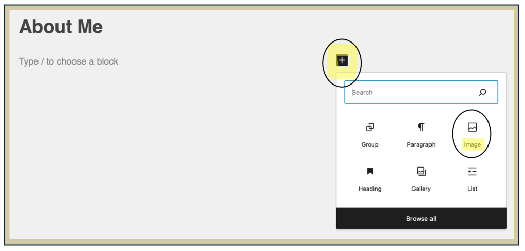 To add an image to your About Me page, click the plus sign (+) on your screen or type /image on a new line.