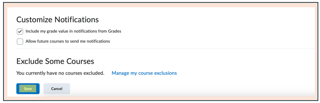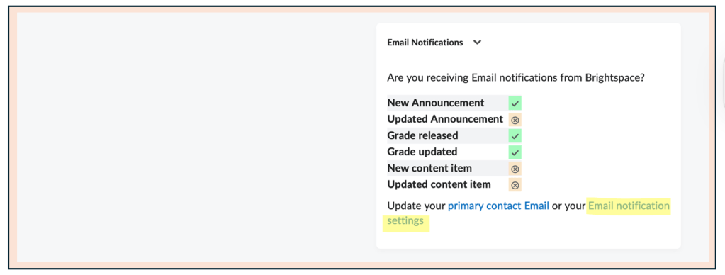 | Goal: Be able to change your email preferences in Brightspace so that you receive emails for announcements and any other updates you’d like. |
