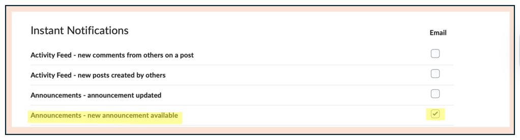 | Important: You need to ensure that you have a checkmark next to “New Announcement.” The rest of the settings are up to you. |