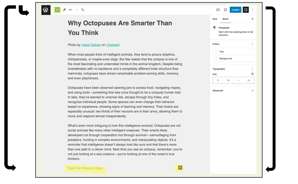 - To add an image to your blog post, click the plus sign (+) on your screen or type /image on a new line to insert an image block.