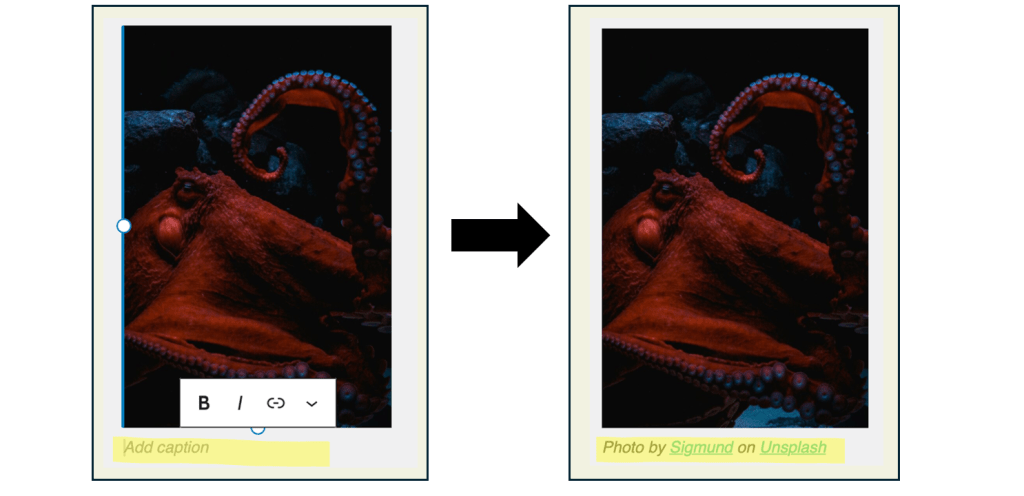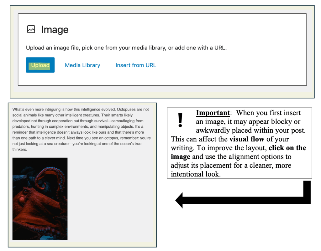 | Important: Just like with your featured image, it’s important to include attribution for any images you add to your post. You can do this by clicking on the image and using the Caption field to credit the photographer or source. |