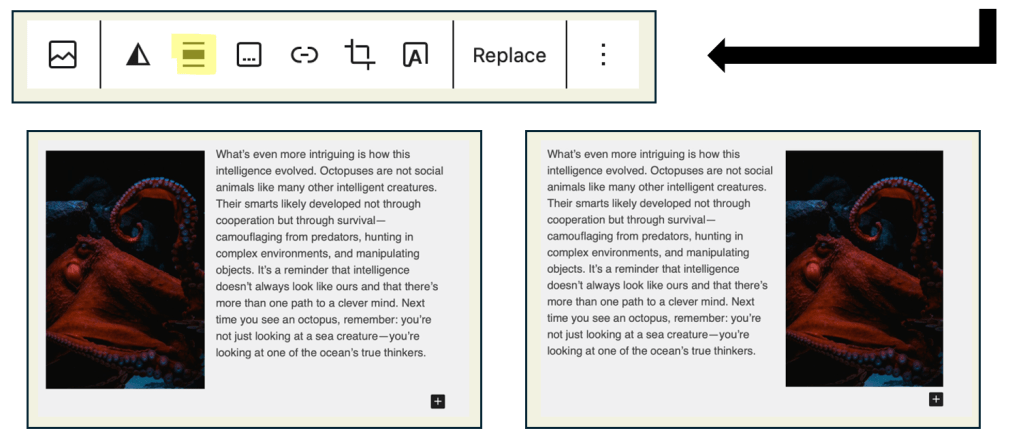 | Tip: After adding an image, click on it to access additional formatting options. Use the Align button to wrap text around the image—this helps your layout look more polished and less clunky (Try ‘Align left’ and ‘Align right’) |