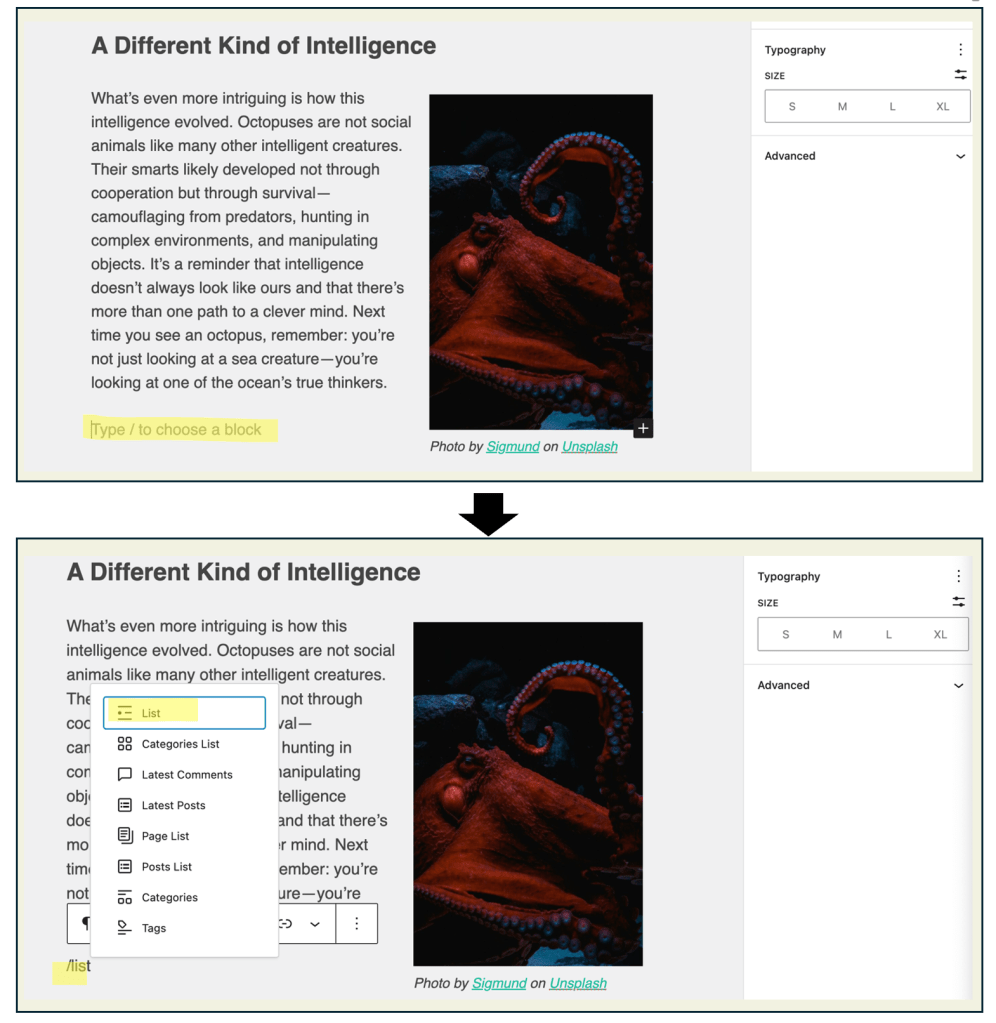 - To add a list to your blog post, click the plus sign (+) and select List, type /list on a new line, or simply use the bullet point icon on the toolbar. Press Enter after each item to create a new bullet.
