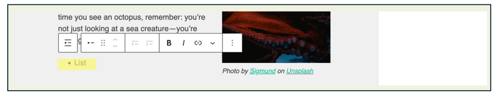 | Task: Practice creating a list in your blog post. Try using both the toolbar and typing * (Shift + 8) followed by the space bar. Decide whether a bulleted or numbered list best fits your information, and rewrite one paragraph from your draft as a list to make it clearer and easier to read. |