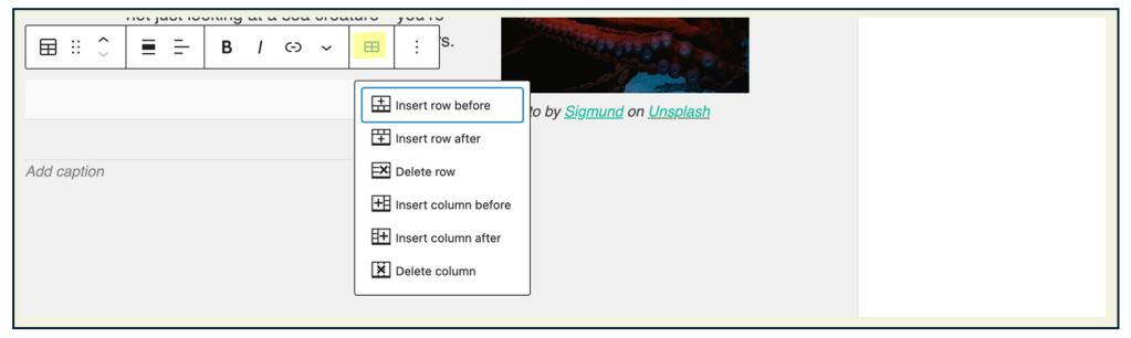 | Task: Practice editing your table. Click the Table button in the toolbar and explore the dropdown menu to add or delete rows or columns, adjust the table size, or change the table’s style. Make at least one edit to your sample table and preview how it looks in your blog post. |