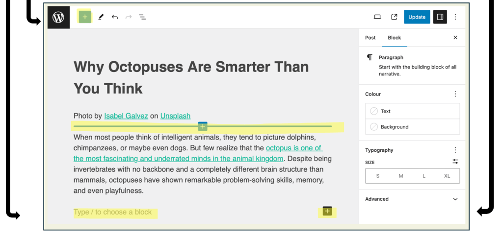 - To add a video, click the plus sign (+) or type /youtube (or /video) on a new line, then paste the URL of the video you want to embed.