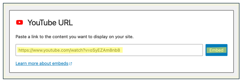 | Important: To have a video embed directly into your post like the example above, it must be from YouTube. If you’re sharing a TED Talk, make sure to find the YouTube version, not the one hosted on the TED website. Only YouTube links will automatically embed in WordPress. |