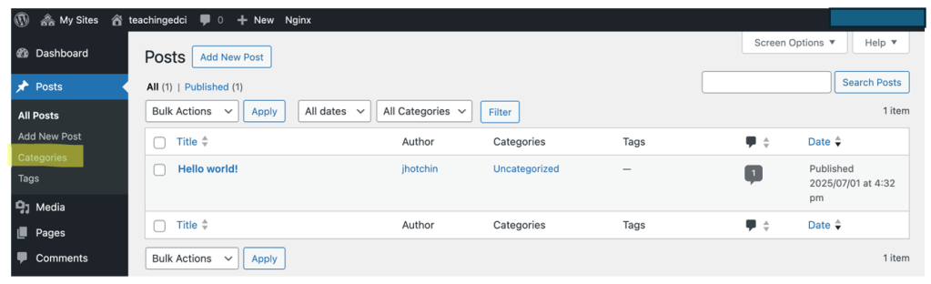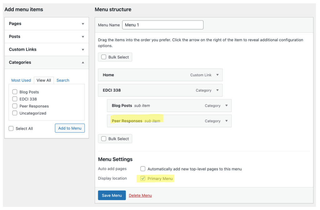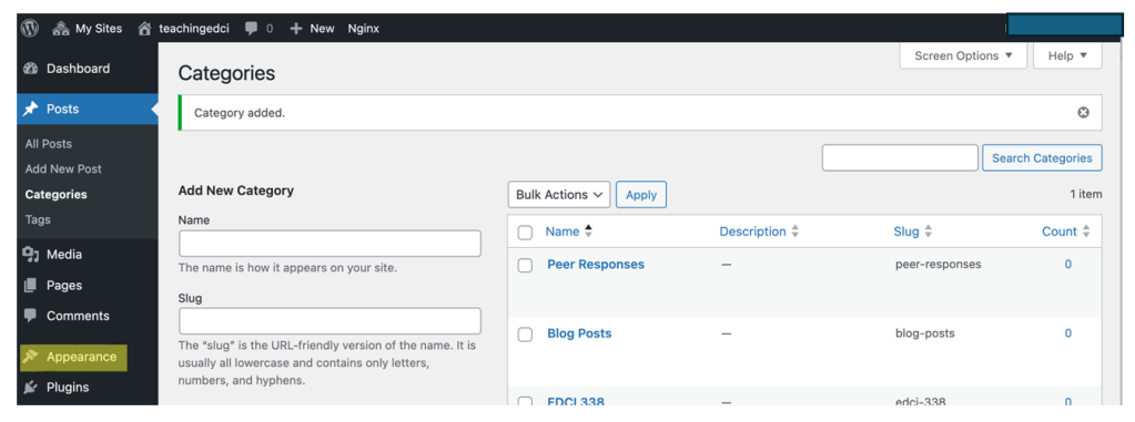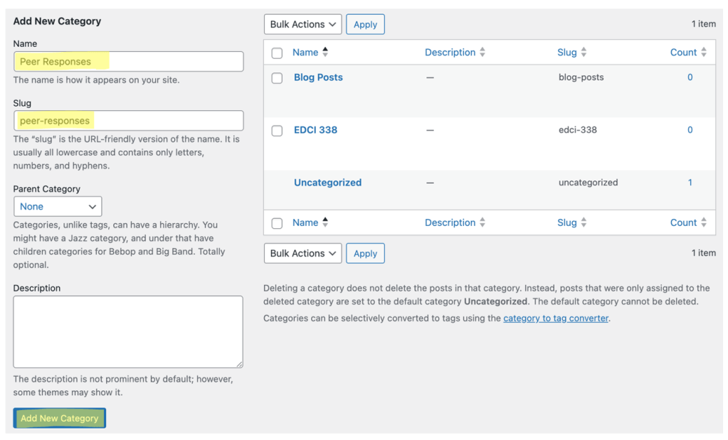 - Add a new category (The Name will be “Peer Responses.”; The Slug can be “peer-responses.”)