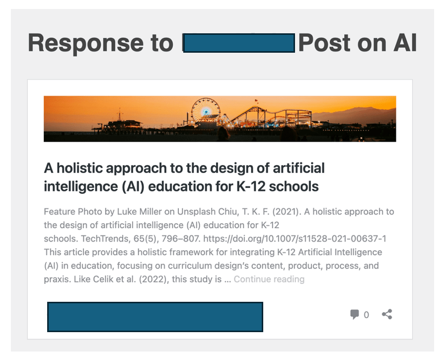 | Goal: The goal is to make sure your post is published under the right category and that you’ve embedded your peer’s blog post into your own, so your responses are organized and easy for others to find. |