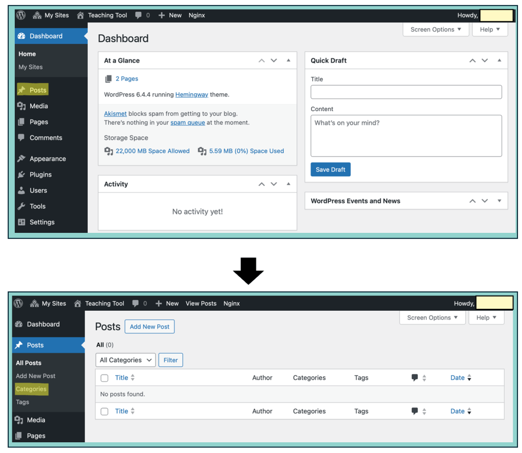 - In your Dashboard, click on Posts from the left-hand menu. When the dropdown appears, select Categories to begin organizing your content.