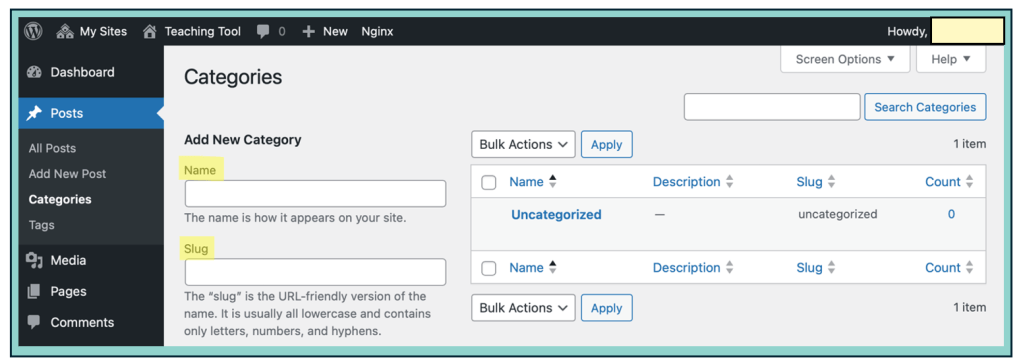 - Add new categories to organize your blog posts by entering a Name (e.g., “Reflections”) and a Slug (a short, lowercase version with no spaces, e.g., reflections) for each section. Then click Add New Category to save.