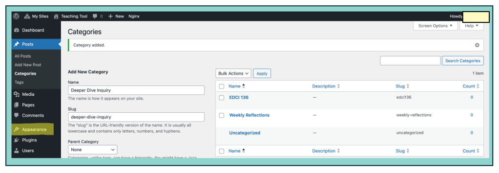 | Important: For the remainder of this guide, I am going to pretend that I am a student in EDCI 136 with the course assignments of Deeper Dive Inquiry and Weekly Reflections. Therefore, I will make three categories: – EDCI 136 (name) // edci136 (slug) – Weekly Reflections (name) // weekly-reflections (slug) – Deeper Dive Inquiry (name) // deeper-dive-inquiry (slug) |