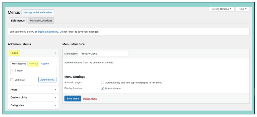 - This is where you can add items to your menu, such as pages, categories, or custom links, to help visitors navigate your site.
