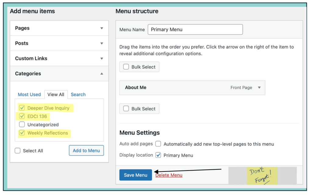 | Task: Add the categories you created to your menu. This helps organize your blog posts by topic and makes it easier for your instructor and visitors to find the content you’re creating throughout the course. |