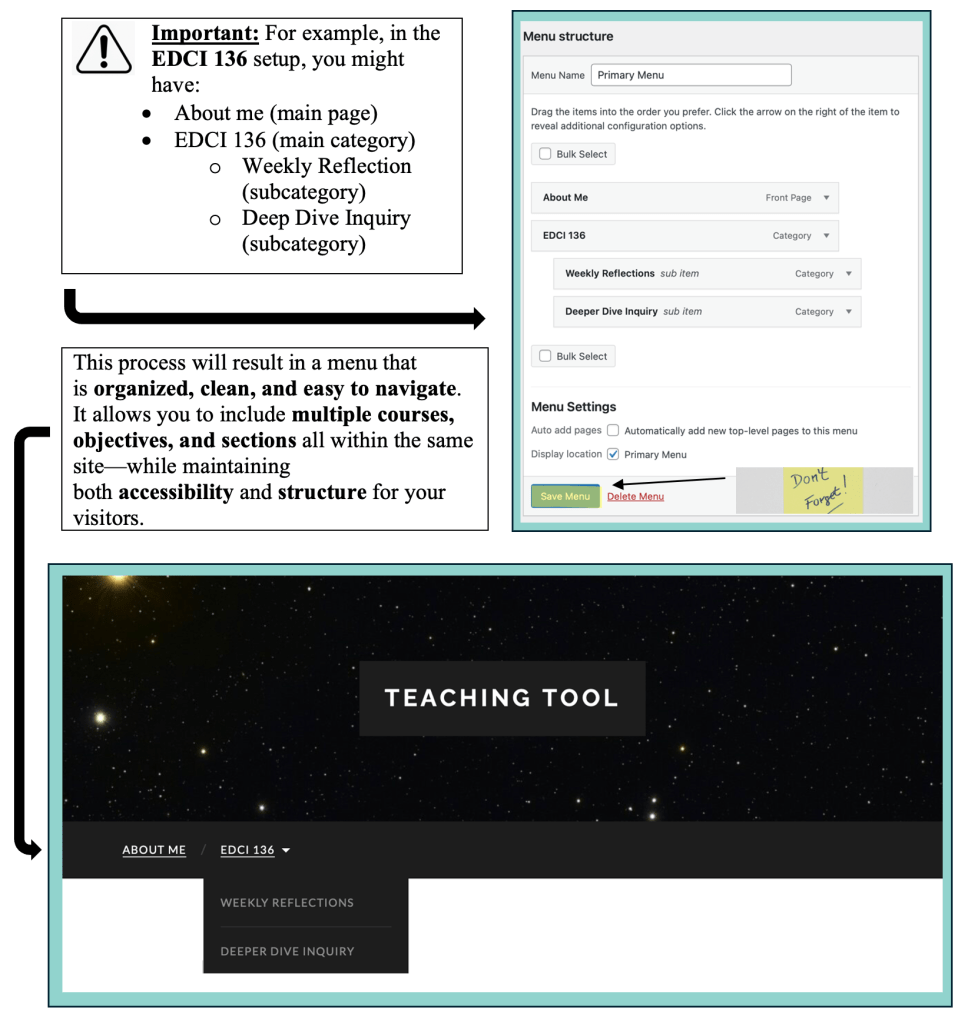 | Important: The categories you create will depend on your course, instructor, assignments, and how you intend to use your site. You are encouraged to explore and experiment with different categories to suit your needs. For example: – If you are in EDCI 136 and required to complete weekly reflections and a deep dive inquiry, you might create the categories: EDCI 136, Weekly Reflections, and Deeper Dive Inquiry. – If you’re in EDCI 338 with assignments like blog posts, peer responses, and a micromodule overview, you might create: EDCI 338, Blog Posts, Peer Responses, and Micromodule Overview. The exact categories may vary for any course or section you are in, but the process for creating them remains the same. |
