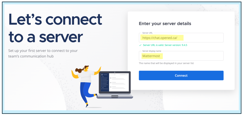 – Server Display Name: You can choose any name that helps you recognize the server, such as “OpenETC Chat” or “UVic Mattermost.”
